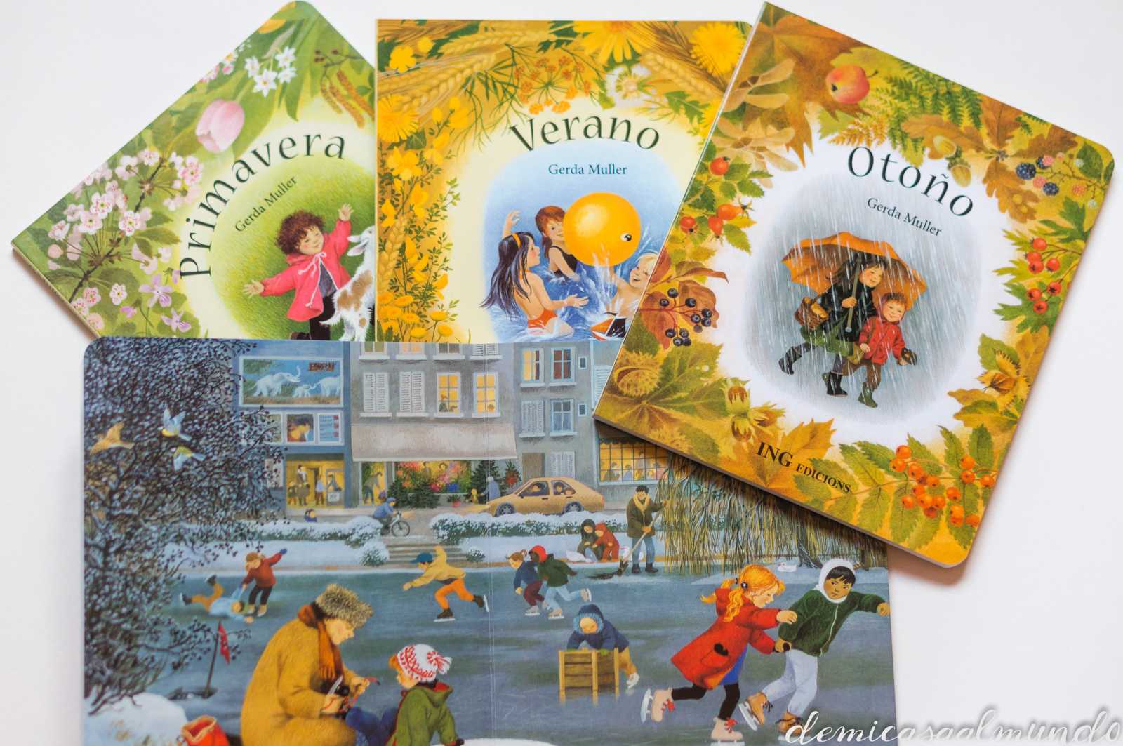 La serie Estaciones por ejemplo de Gerda Muller, una colección de libros Waldorf que nos ayuda además a integrar el ritmo de las estaciones en el hogar, son de mis favoritas. (Puedes encontrarlos en nuestro Atelier). Imágenes bellas, escenas cotidianas, familiares, que invitan a contar historias, describir situaciones, nombrar palabras,…