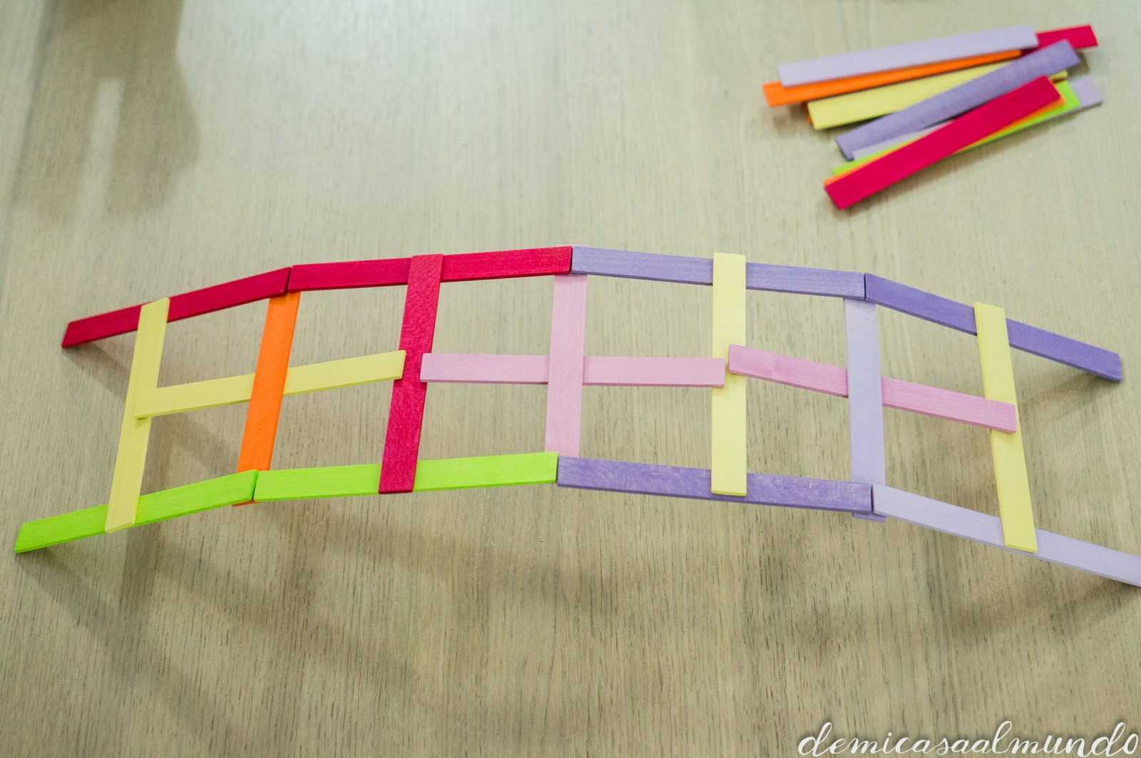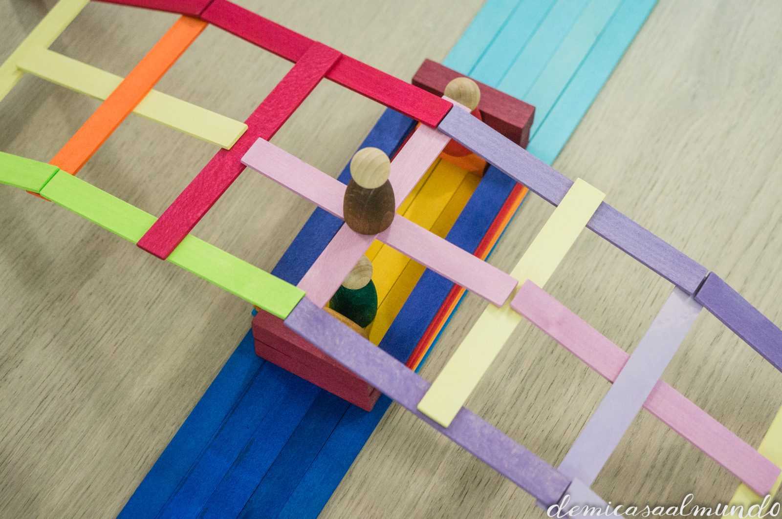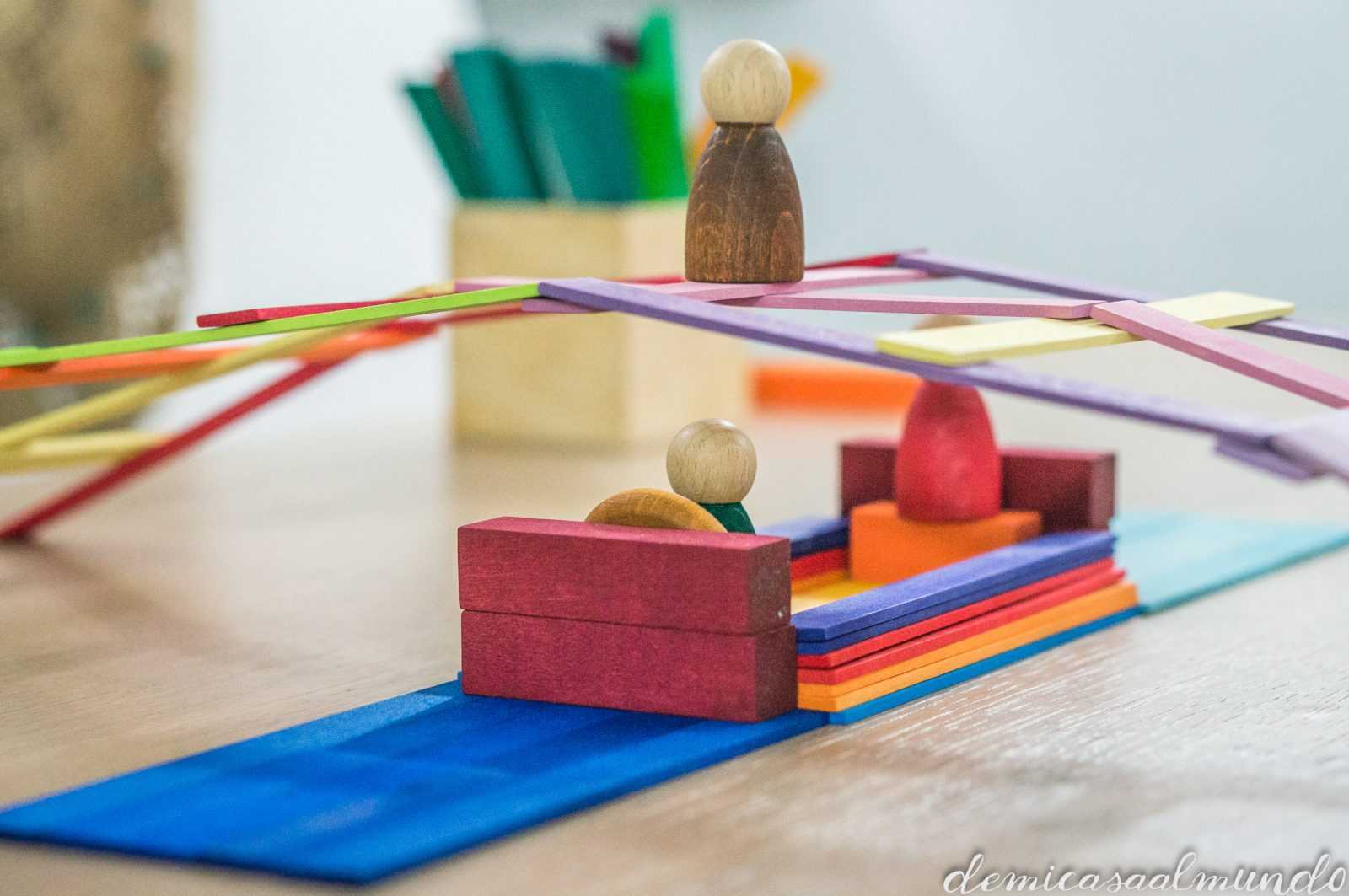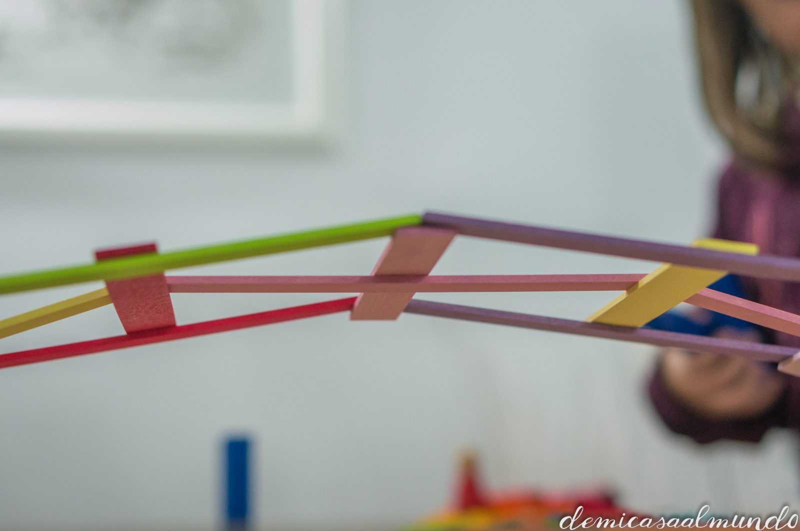 Es un material waldorf de Grimm’s (esa marca alemana de juguetes naturales y artesanales que tanto nos gusta, entre sus bestsellers encuentras el gran arcoíris Waldorf), y que se conoce como el puente Leonardo (o puente Vinci).