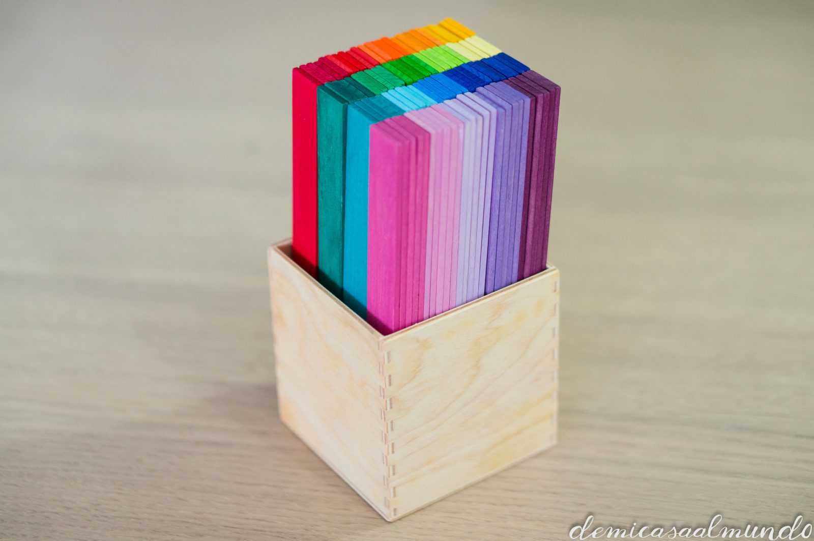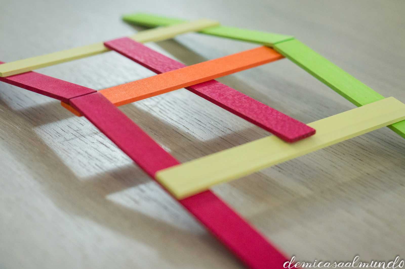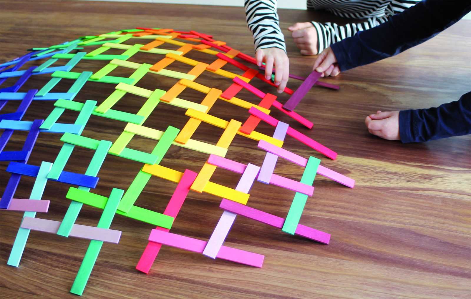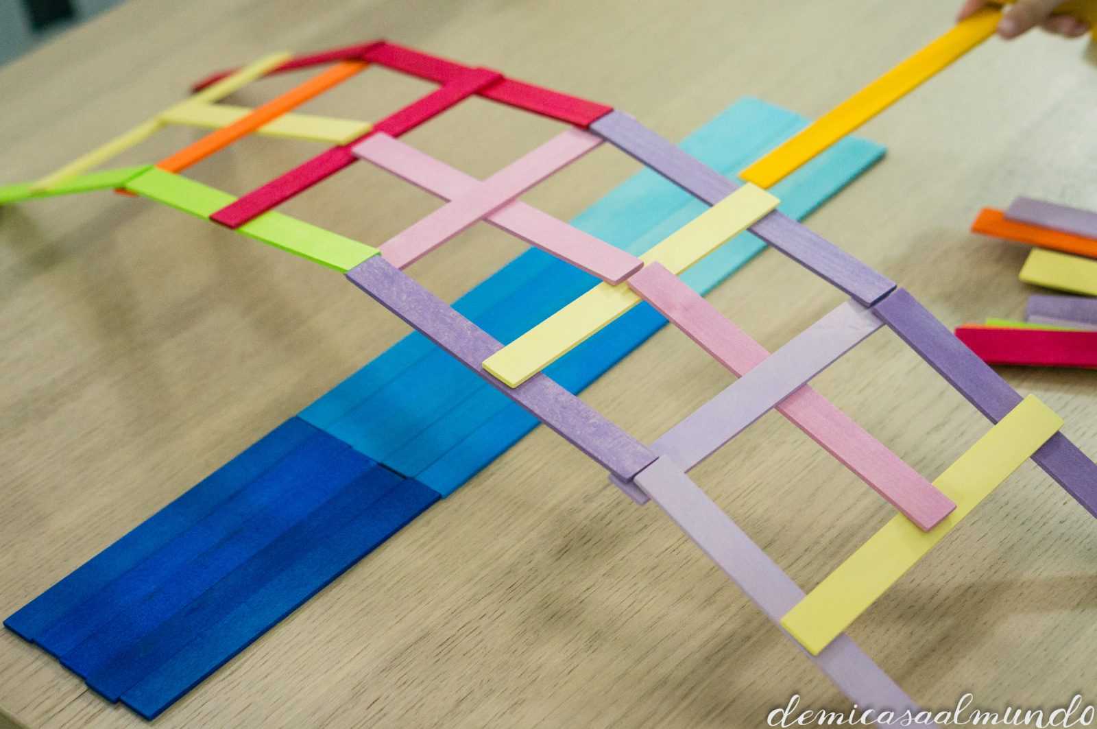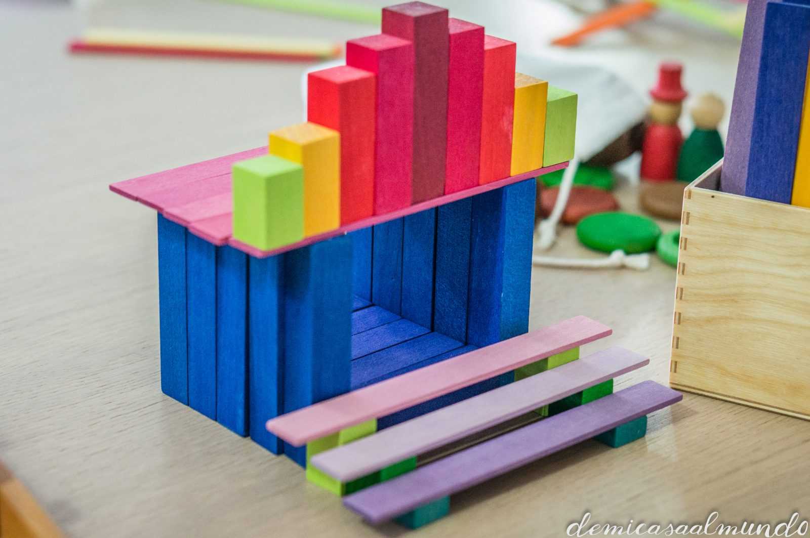 Es un material waldorf de Grimm’s (esa marca alemana de juguetes naturales y artesanales que tanto nos gusta, entre sus bestsellers encuentras el gran arcoíris Waldorf), y que se conoce como el puente Leonardo (o puente Vinci).