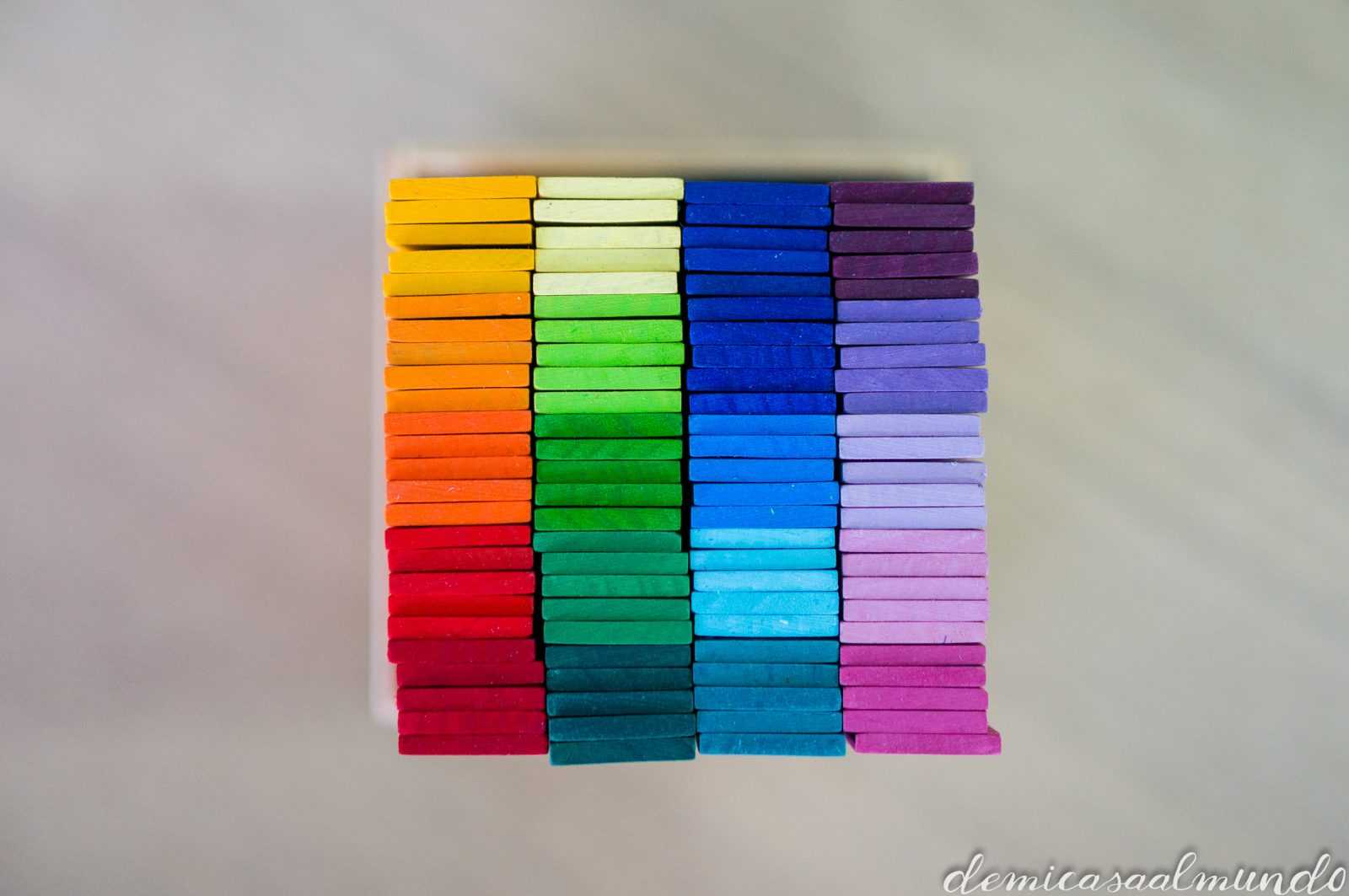 Desde agrupamientos por color, construcciones y composiciones diversas en 2D y 3D (dibujos, paredes, torres, escaleras…), integrarlo en el juego simbólico (pueden ser unos fideos de sopa estupendos, o el suelo de una casa, o un río…), para iniciarse en la numeración y el sistema decimal (son 100 tablillas con los colores del arcoíris),…