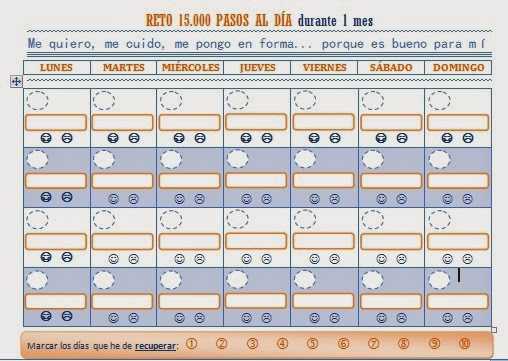 Mi propuesta es caminar cada día 15.000 pasos durante un mes. Y si por algún motivo resultara imposible, al menos debo llegar a los 10.000 y en consecuencia alargar el reto un día más.Lo iré controlando todo en esta hoja de planning que he preparado para ello.