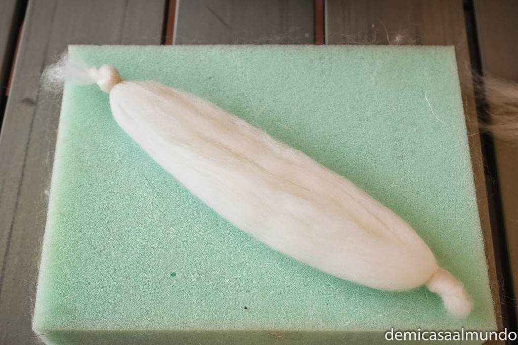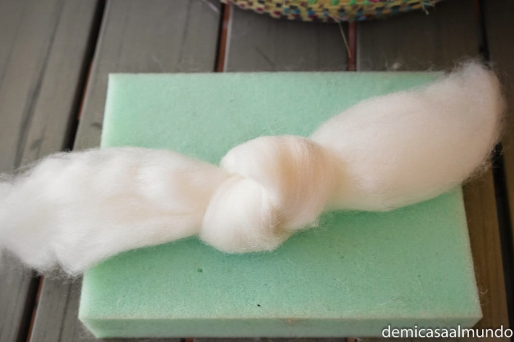 Hacemos un nudo en los dos extremos y pinchamos un poco con la aguja para acabar de unir las fibras y hacer las manos.