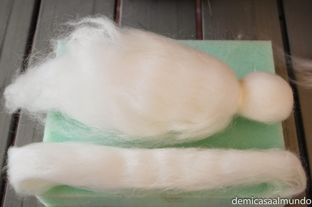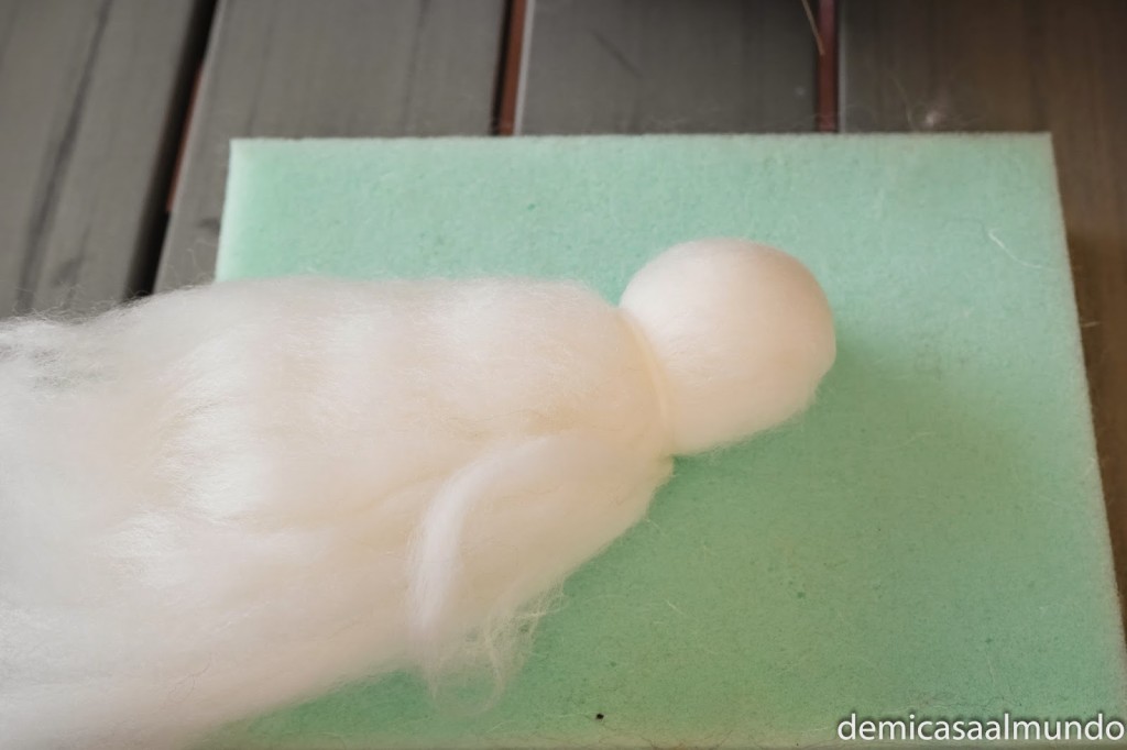 Giramos uno de los extremos sobre el otro. Ya tenemos la cara y la base del cuerpo. Es el momento de marcar el cuello con una pequeña tirita de lana, puedes hacer un nudo detrás o simplemente pincharlo un poco con la aguja, y se van entrelazando (viene a ser coser) las fibras.