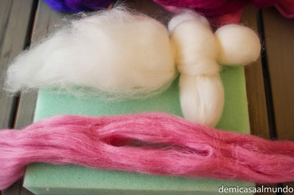 - Lana peinada de merino blanca y de colores. Aquí te expliqué donde puedes conseguirla. Un hada mediana puede pesar alrededor de 25g de lana. Así que no necesitas mucha.